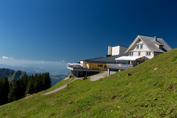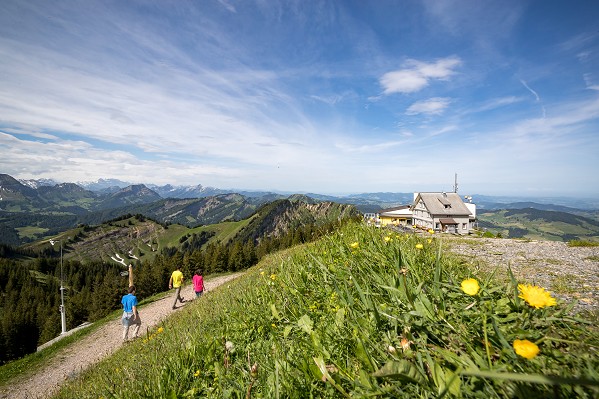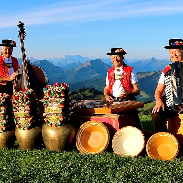 Mit der Luftseilbahn geht es bequem hinauf auf den 1'663 Meter hohen Aussichtsberg. Oben angekommen, geniessen wir ein feines Mittagessen in geselliger Runde - und lassen uns von den Warth-Buebe unterhalten: Mit Talerschwingen, Hackbrettmusik und kernigen Appenzeller-Witzen sorgen sie für beste Stimmung und viel Schmunzeln.